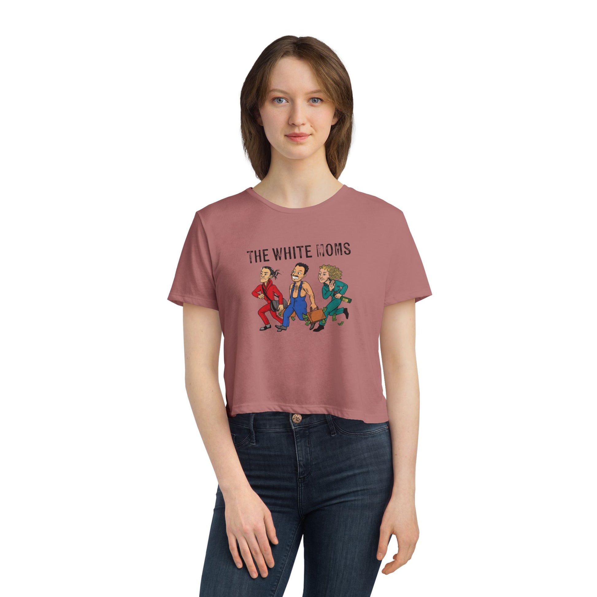 A unisex cropped tee featuring Denver's hip hop trio, 'The White Moms.' This tee has tailored sleeves and a flowy fit, giving it a unique silhouette. It is relevant to music lovers and fans of The White Moms, perfect for casual wear or attending concerts.